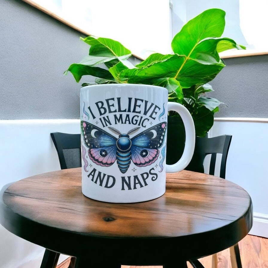 Fun cute mug, 11 oz mug. "I BELIEVE IN MAGIC AND NAPS''.