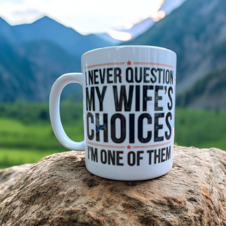 Fun cute 11 oz ceramic mug. "Never Question My Wife's Choices I'm One Of Them"