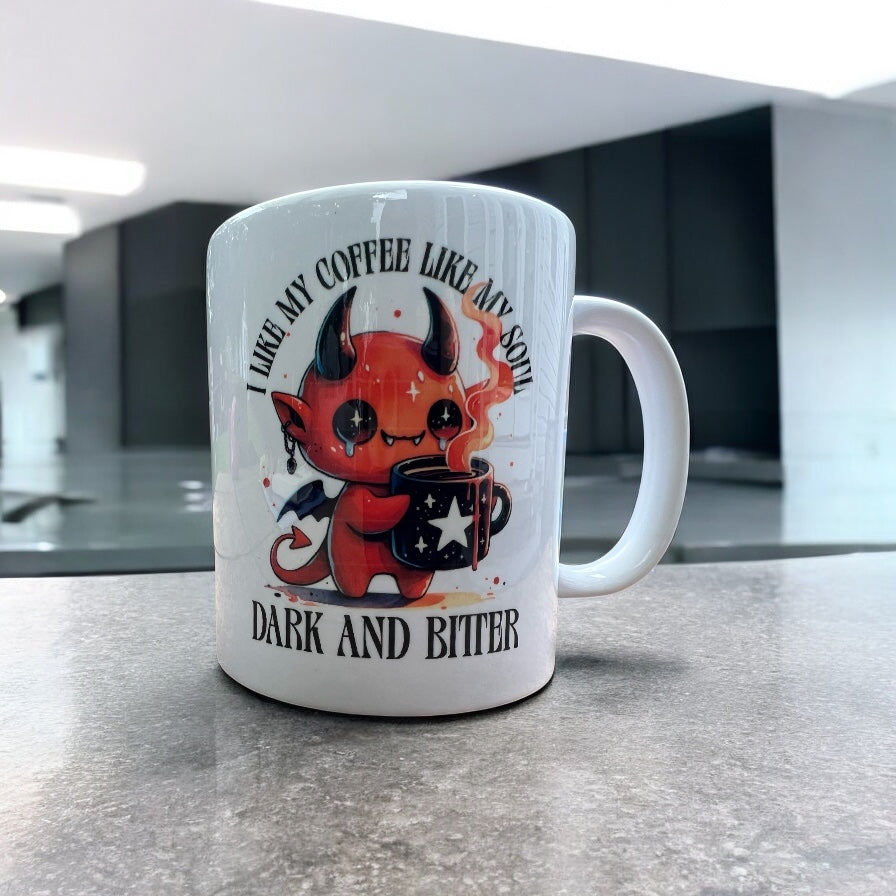 Fun cute 11 oz ceramic mug. "I Like My Coffee Like My Soul Dark And Bitter"